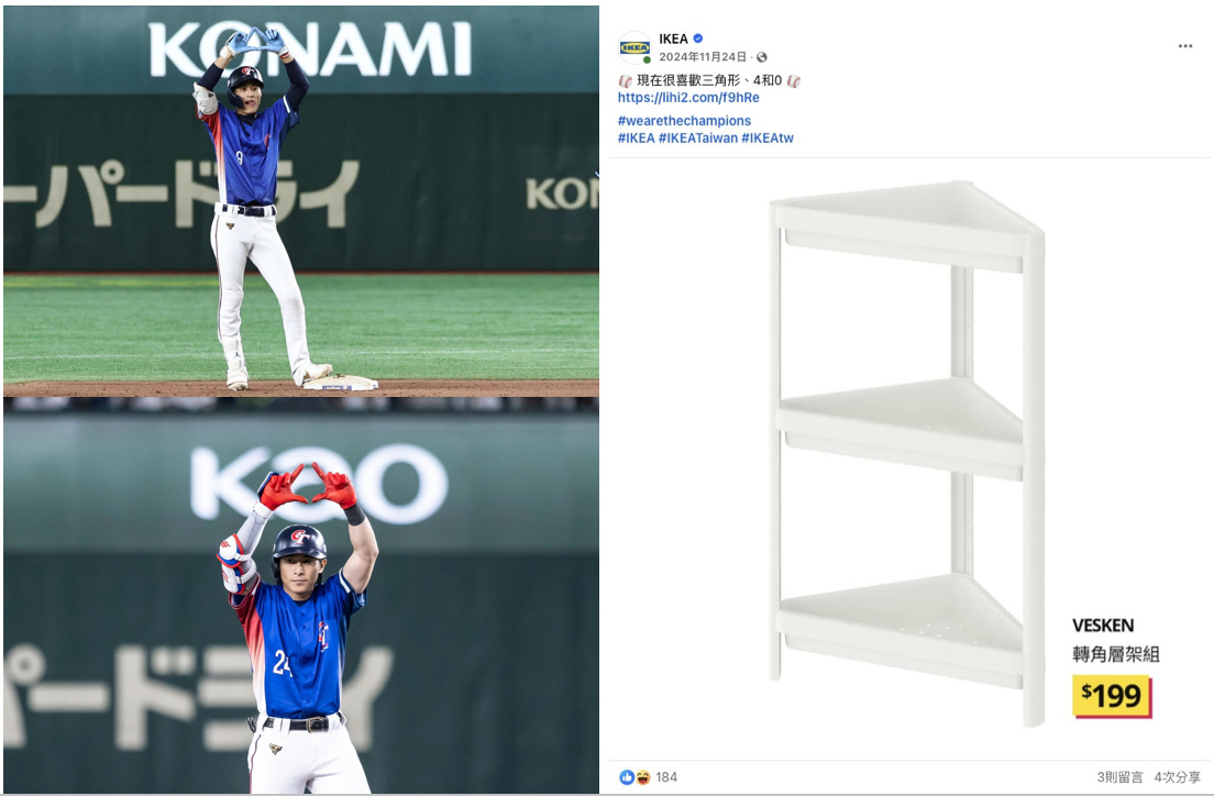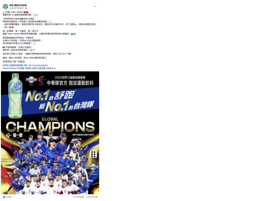 去年11月,中華隊奪得世界棒球12強賽冠軍,社群上諸多品牌搭著時事效應,發起歡慶搭配促銷。雖細看各品牌採取的策略各有不同,但都緊扣與大眾「共情」的甜蜜點。