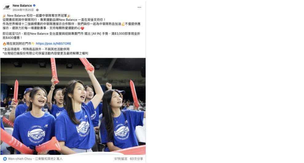近年來在品牌年輕化經營有聲有色的New Balance自然也不會缺席,值得注意的是文案中提到「與中華隊同行」、「應援衣合作夥伴」都能有效為情感共鳴加分,並且促銷活動亦搭配了本屆賽事的默契密碼「ALL IN手勢」,延續球迷澎湃的參與感。