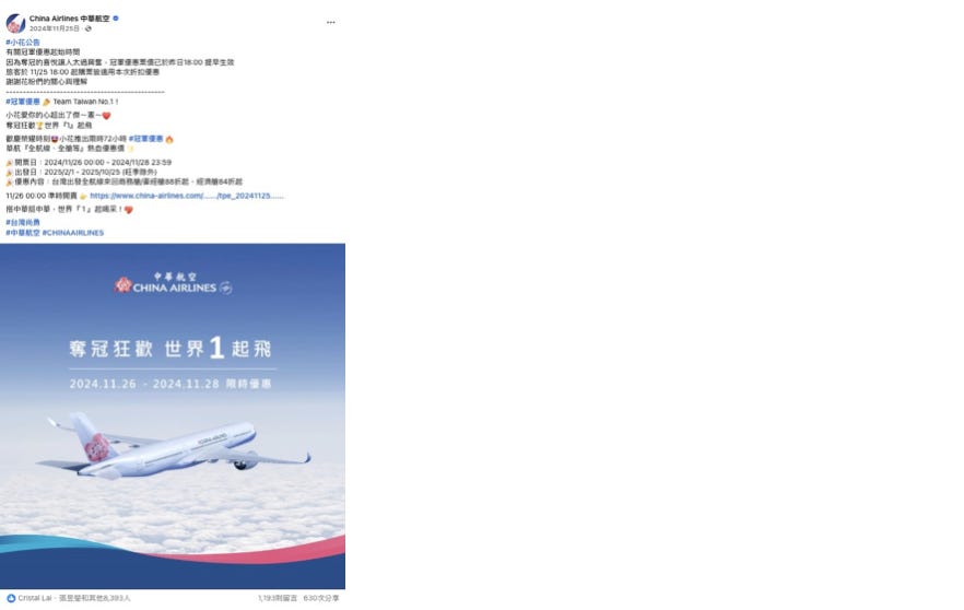 疫情後的報復性旅遊潮還未結束,華航也趁此機會操作冠軍優惠票價,值得注意的是使用「世界 1 起飛」讓人聯想「世界第一」,歡慶的氛圍也適合掏出信用卡來刷機票,是非常成功的聲量操作,可惜官網當機難免引起抱怨,這也考驗著品牌的緊急應變能力。