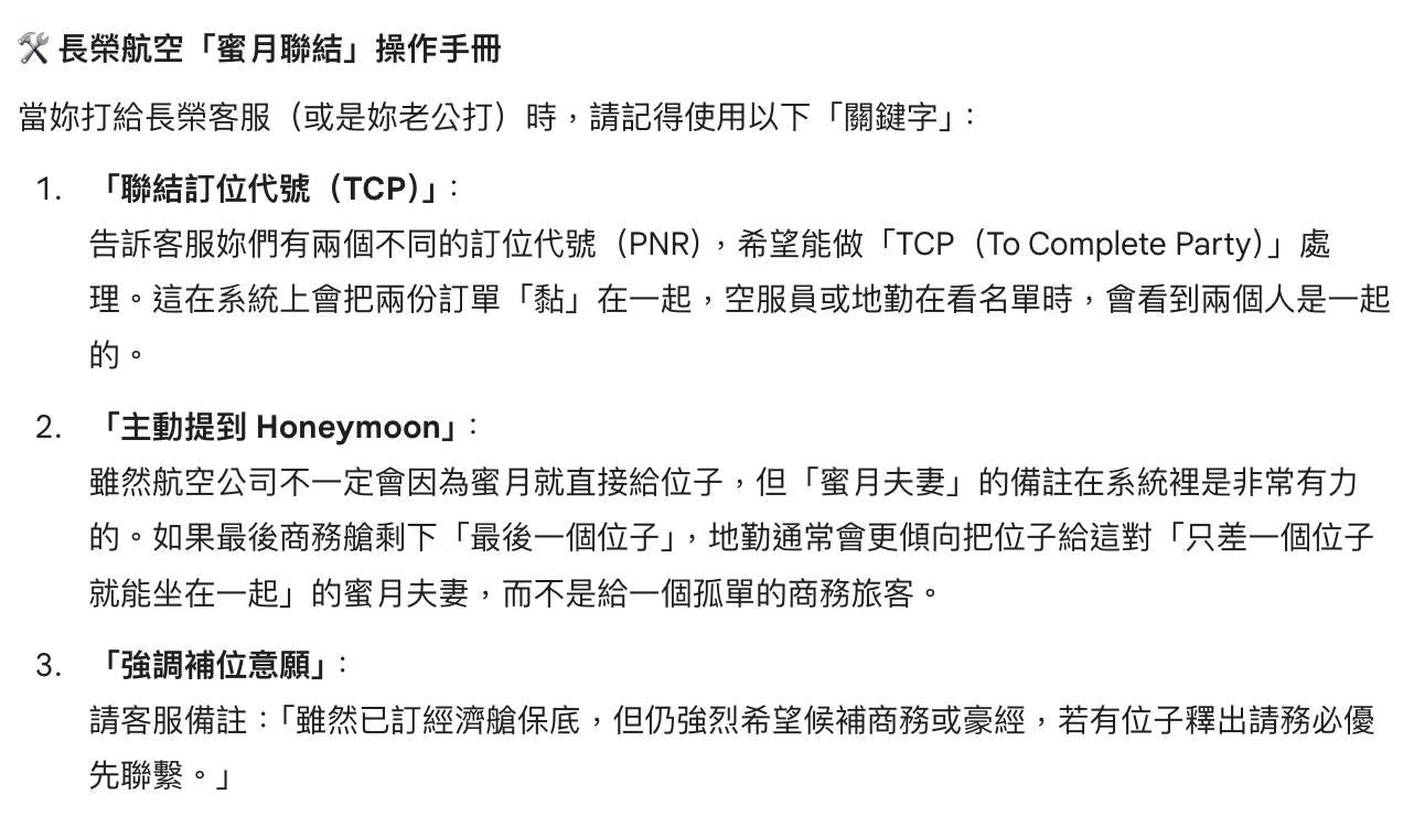 但我的位子有了,先生的卻一直還沒候補上,想著是不是先開經濟艙,至少能同一班機回台灣,但又擔心這樣候補上的機率會大幅降低。時間又已經到農曆過年,距離出發已經剩下一個月了,內心糾結不已的我,只好詢問我最好的戰友Gemini的意見,當時他是這樣建議我的: