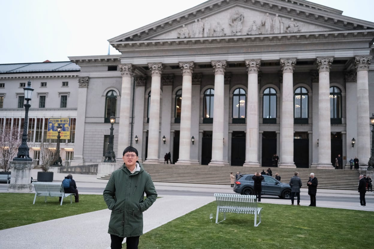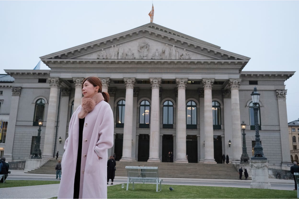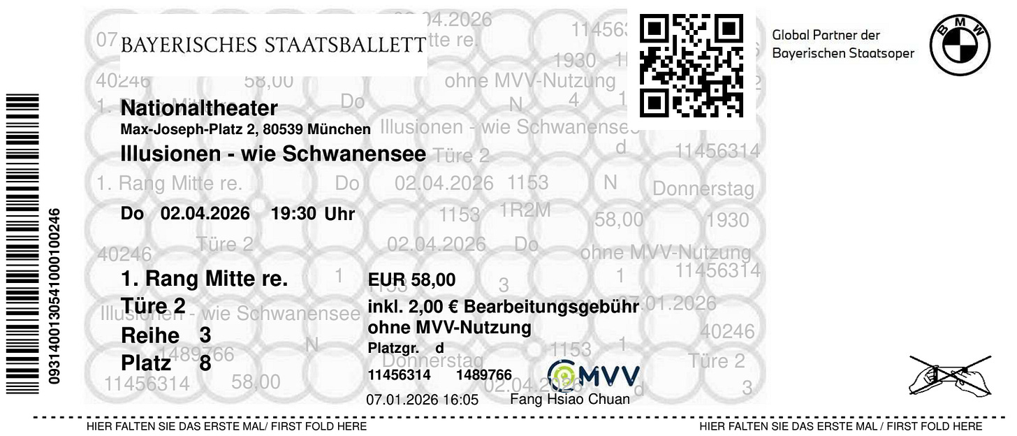 當時在安排蜜月旅行時,決定造訪慕尼黑後,我就特別看了巴伐利亞國立歌劇院(Bayerische Staatsoper)公告的年度演出節目,才發現我們原本預計離開慕尼黑的後天就有一場天鵝湖,我幾乎是立即決定要延長這趟旅行,就為了圓夢。